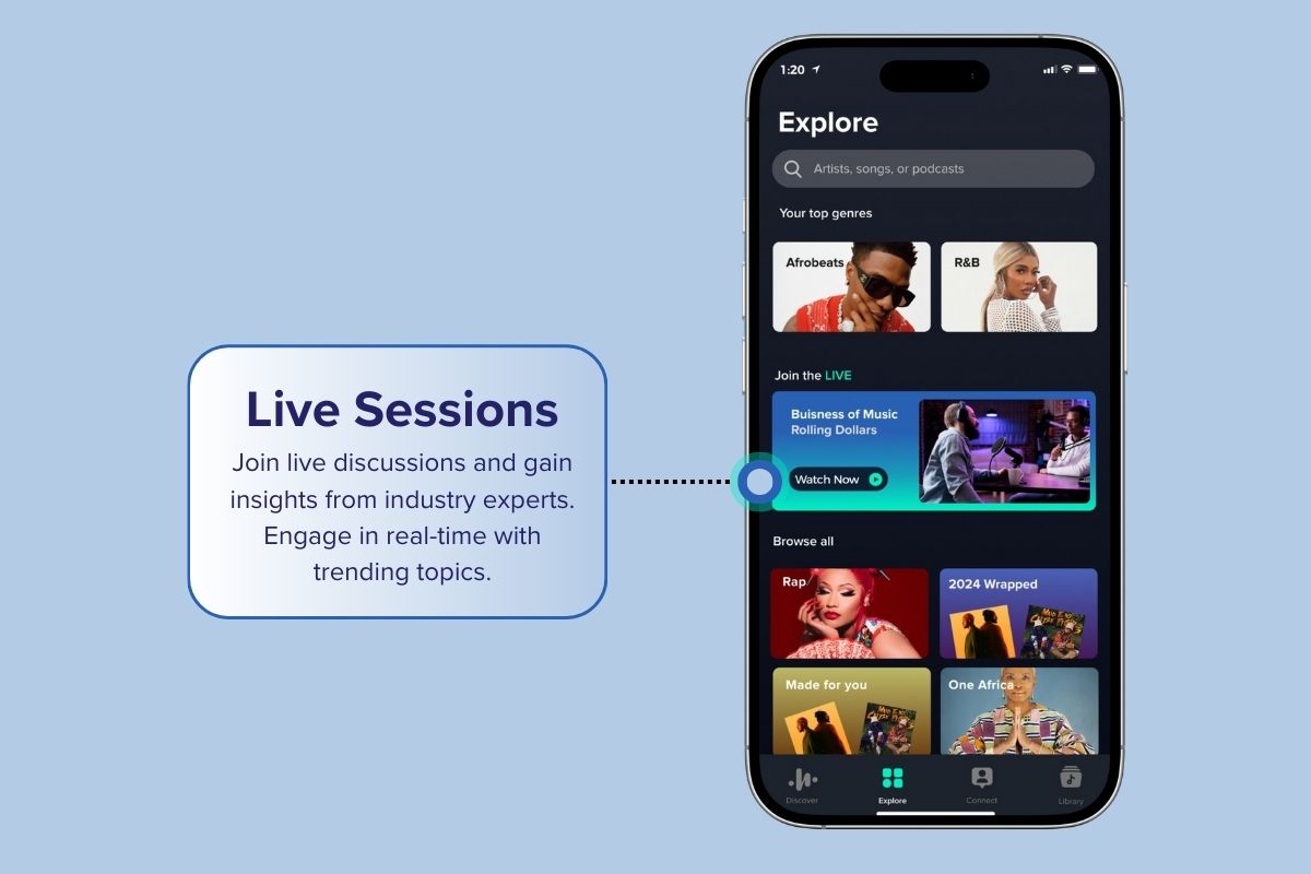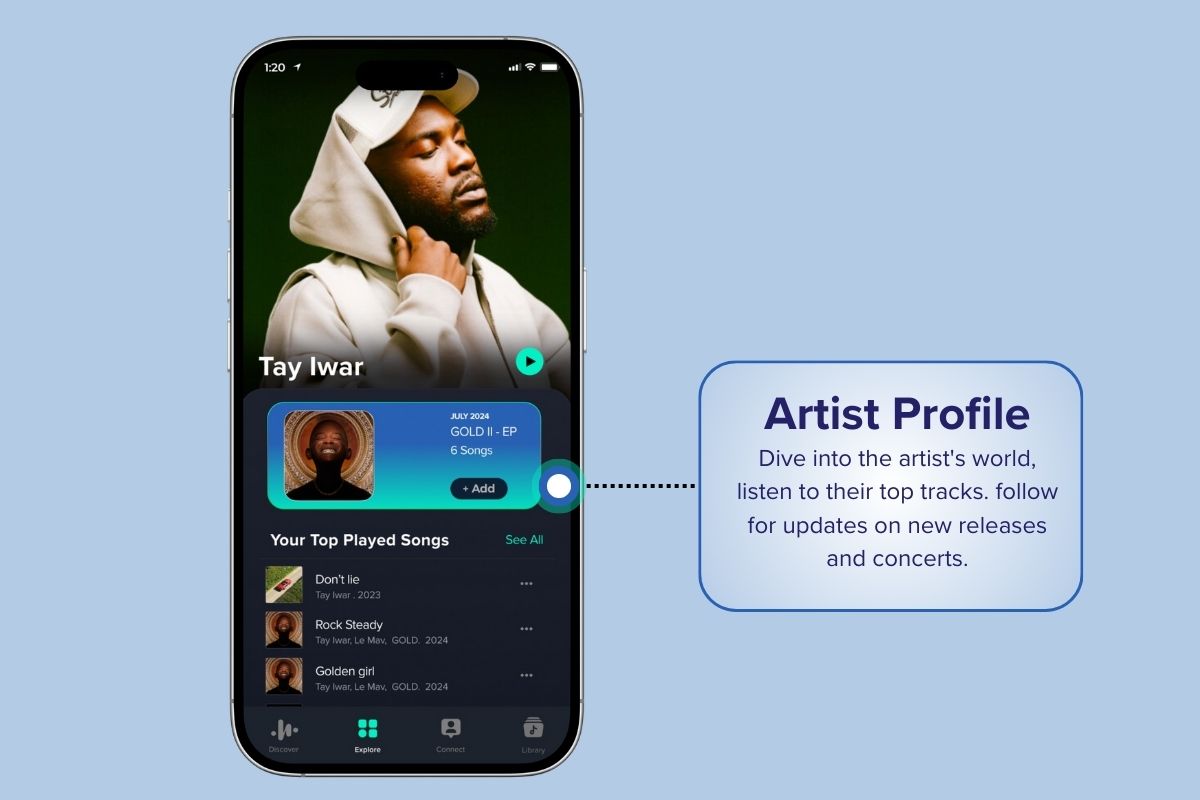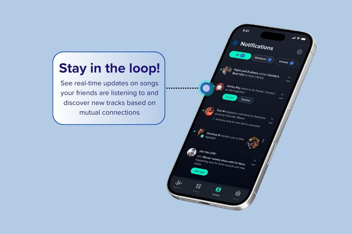 The Waves music app is thoughtfully designed to enhance the experience of streaming and connecting through music. Its logo is a standout feature, fusing a “Play” button with a “Sound wave” to communicate its core functionality. This clever abstraction visually represents the app’s purpose: enabling users to stream music effortlessly while fostering connections with friends through shared playlists or musical preferences.